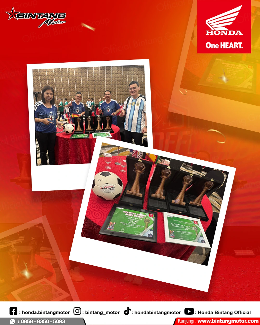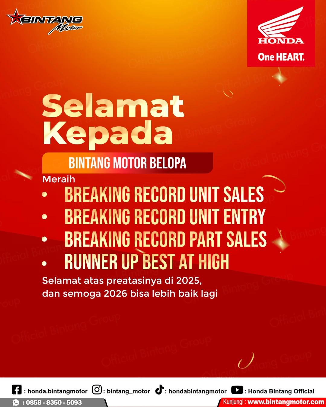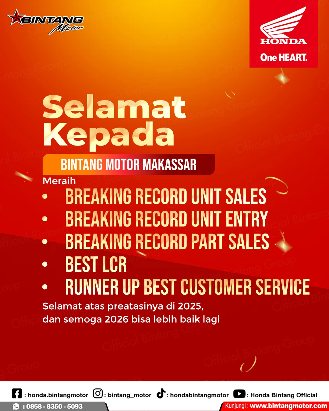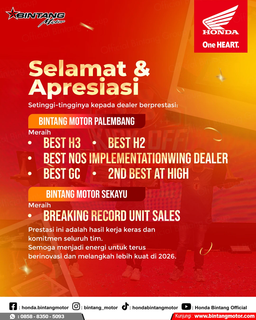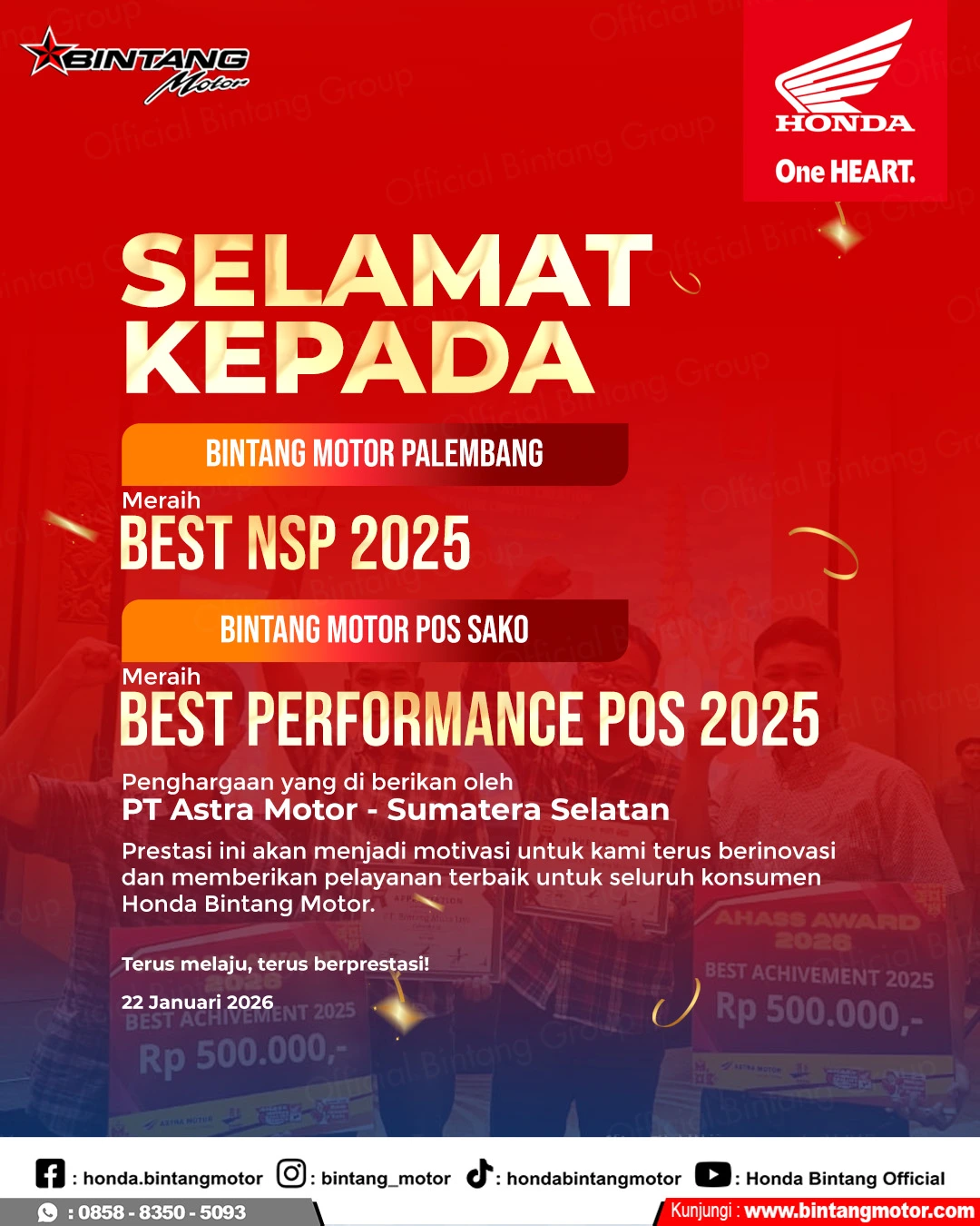 Dalam acara AHASS Kick Off & Regional Meeting 2026 yang diselenggarakan oleh PT Astra Motor Sumatera Selatan pada 22 Januari 2026, Honda Bintang Motor berhasil meraih dua penghargaan bergengsi atas pencapaian sepanjang tahun 2025. Penghargaan tersebut diberikan kepada Bintang Motor Palembang sebagai Best NSP 2025 dan Bintang Motor Pos Sako sebagai Best Performance POS 2025. Pencapaian ini menjadi bukti komitmen Bintang Motor dalam memberikan pelayanan servis terbaik dan inovasi tiada henti bagi seluruh konsumen Honda.