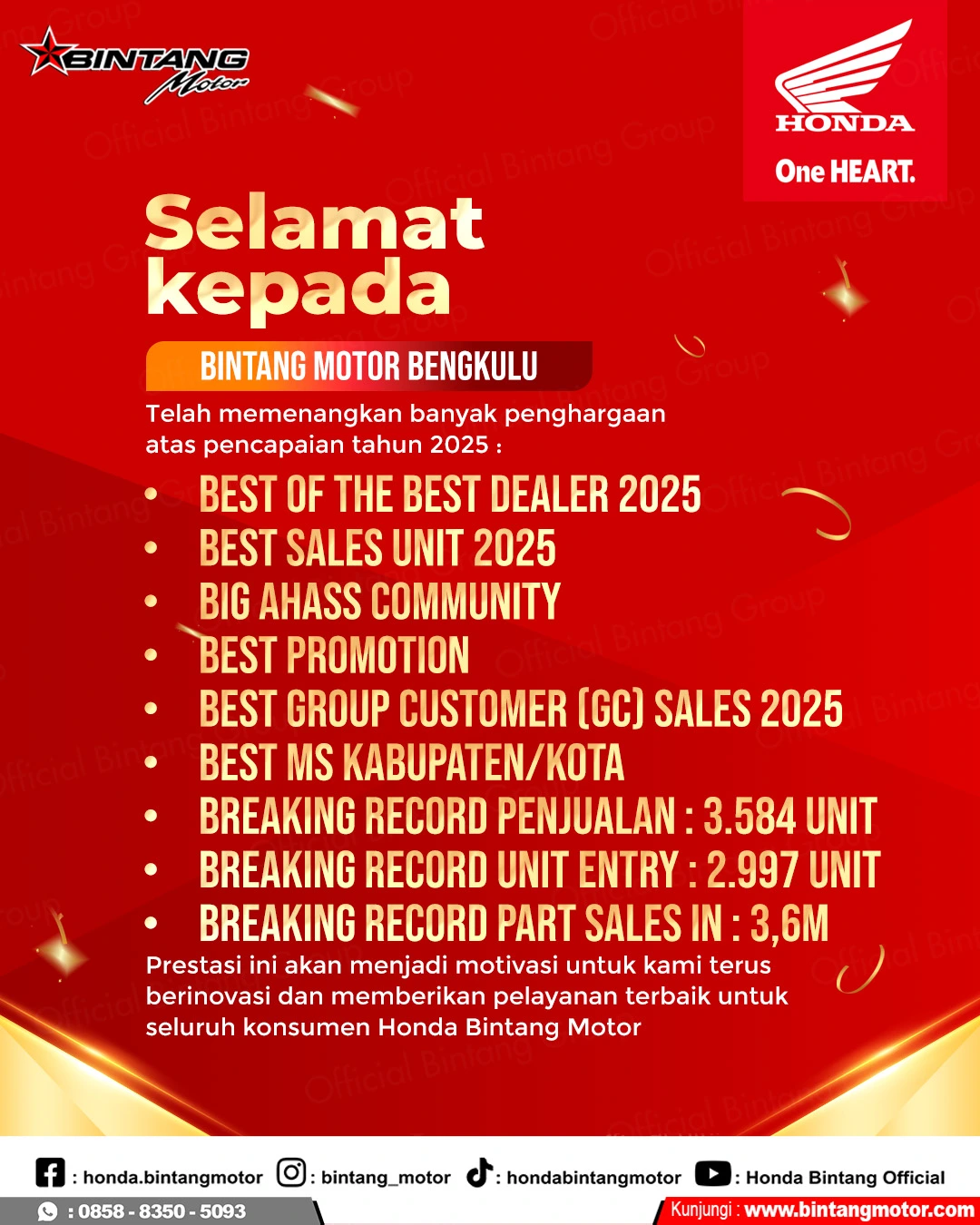Prestasi ini menjadi motivasi besar bagi seluruh tim untuk terus berinovasi dan memberikan pelayanan terbaik bagi konsumen Honda di wilayah Bengkulu pada tahun 2026.